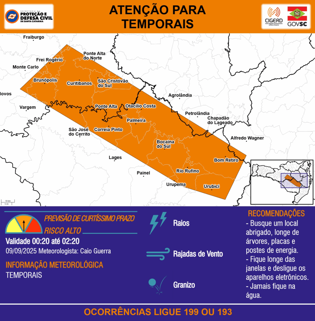 ATENÇÃO – 09/09 00:20 – TEMPORAIS com RAIOS, RAJADAS DE VENTO e GRANIZO para as regiões do Meio-Oeste, Planalto Sul, Grande Florianópolis e Alto Vale do Itajaí nas próximas 2 horas. Ocorrências ligue 199 ou 193.