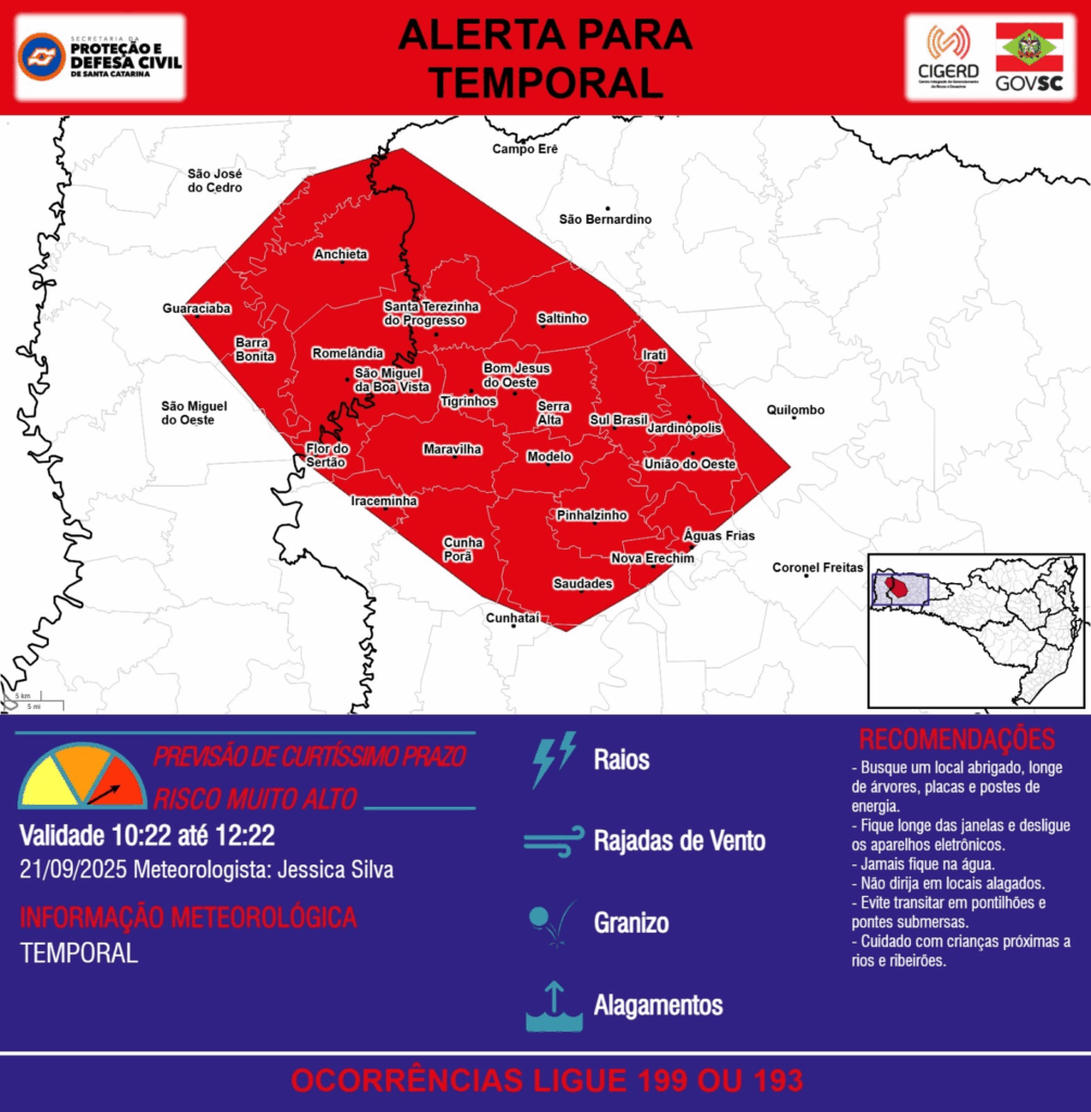 ALERTA – 21/09 10:22 – TEMPORAL com RAIOS, RAJADAS DE VENTO, GRANIZO e ALAGAMENTOS para os municípios de Anchieta, Barra Bonita, Bom Jesus do Oeste, Campo Erê, Coronel Freitas, Cunha Porã, Cunhataí, Flor do Sertão, Guaraciaba, Iraceminha, Irati, Jardinópolis, Maravilha, Modelo, Nova Erechim, Palma Sola, Pinhalzinho, Quilombo, Romelândia, Saltinho, Santa Terezinha do Progresso, Saudades, Serra Alta, Sul Brasil, São Bernardino, São José do Cedro, São Miguel da Boa Vista, São Miguel do Oeste, Tigrinhos, União do Oeste e Águas Frias nas próximas 2 horas. Ocorrências ligue 199 ou 193.