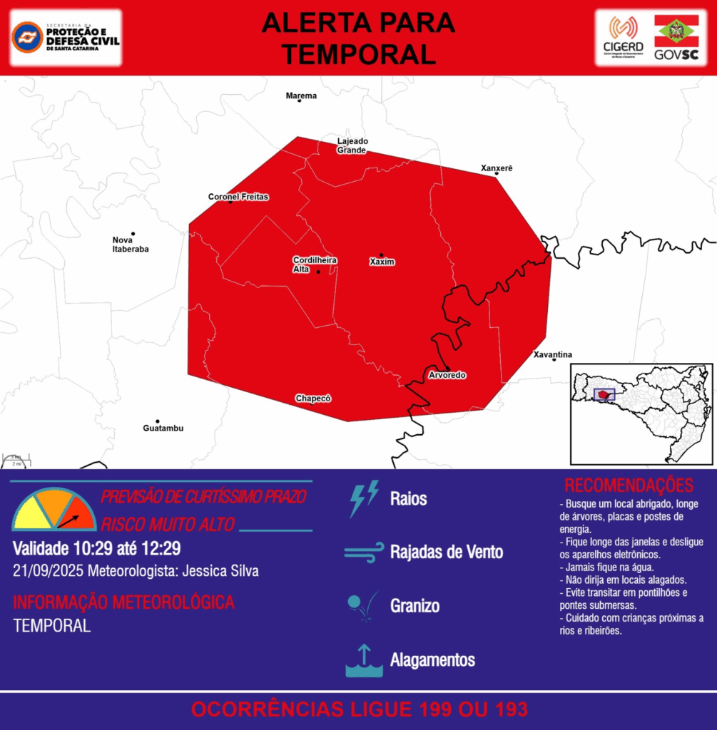 ALERTA – 21/09 10:29 – TEMPORAL com RAIOS, RAJADAS DE VENTO, GRANIZO e ALAGAMENTOS para os municípios de Arvoredo, Chapecó, Cordilheira Alta, Coronel Freitas, Guatambu, Lajeado Grande, Marema, Nova Itaberaba, Seara, Xanxerê, Xavantina e Xaxim nas próximas 2 horas. Ocorrências ligue 199 ou 193.