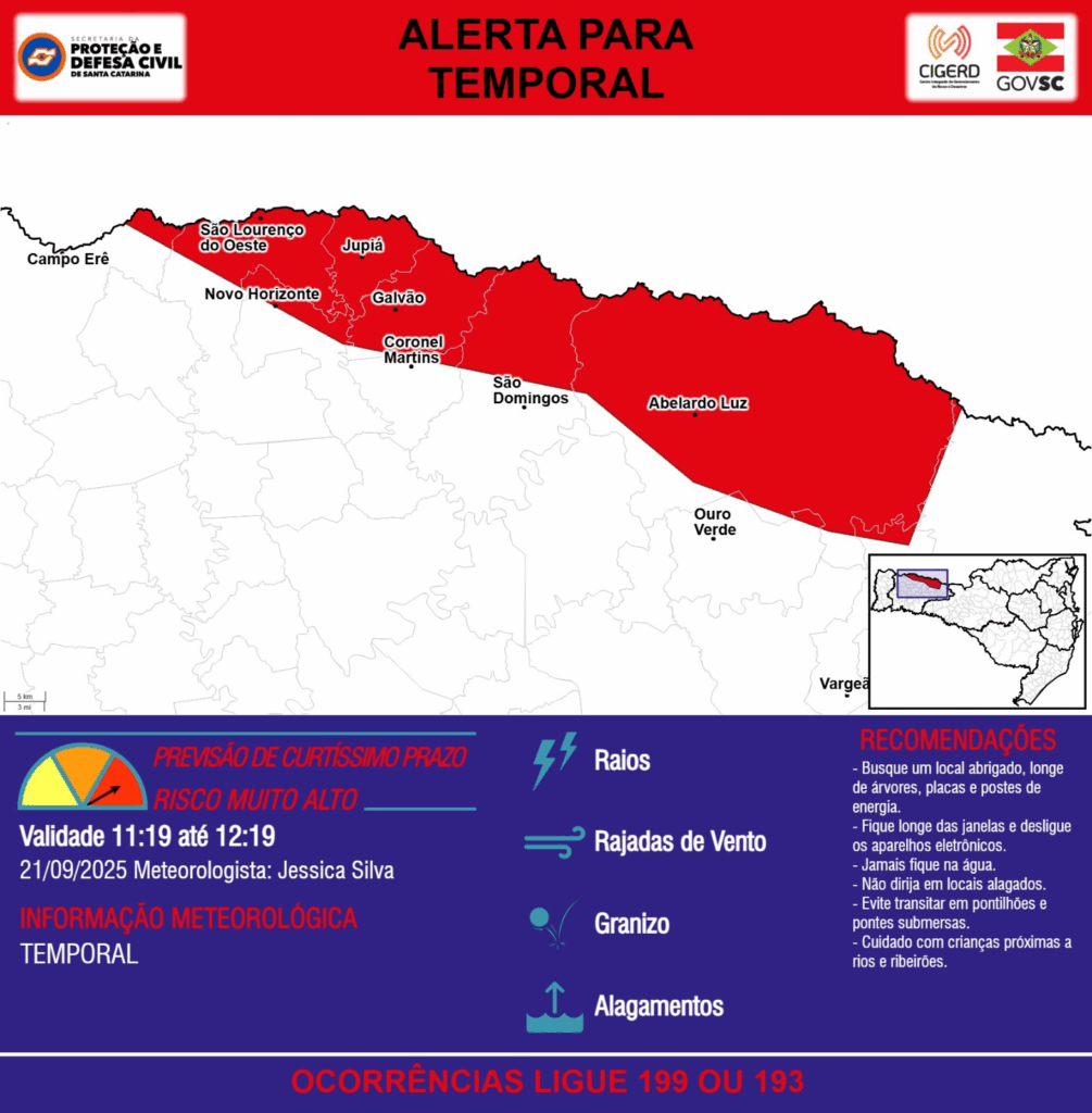 ALERTA – 21/09 11:19 – TEMPORAL com RAIOS, RAJADAS DE VENTO, GRANIZO e ALAGAMENTOS para os municípios de Abelardo Luz, Campo Erê, Coronel Martins, Galvão, Jupiá, Novo Horizonte, Ouro Verde, Passos Maia, São Domingos, São Lourenço do Oeste e Vargeão na próxima hora. Ocorrências ligue 199 ou 193.