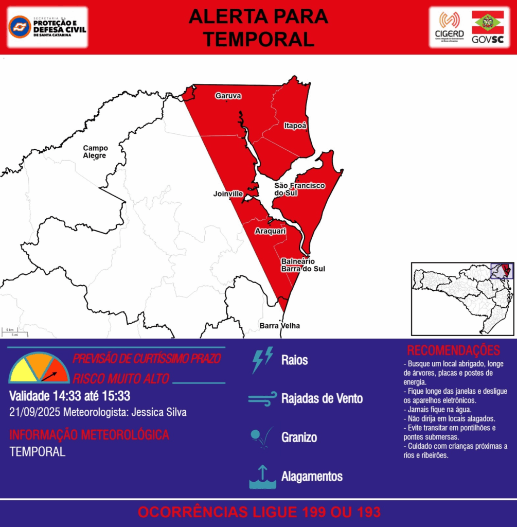 ALERTA – 21/09 14:33 – TEMPORAL com RAIOS, RAJADAS DE VENTO, GRANIZO e ALAGAMENTOS para os municípios de Araquari, Balneário Barra do Sul, Barra Velha, Campo Alegre, Garuva, Itapoá, Joinville e São Francisco do Sul na próxima hora. Ocorrências ligue 199 ou 193.