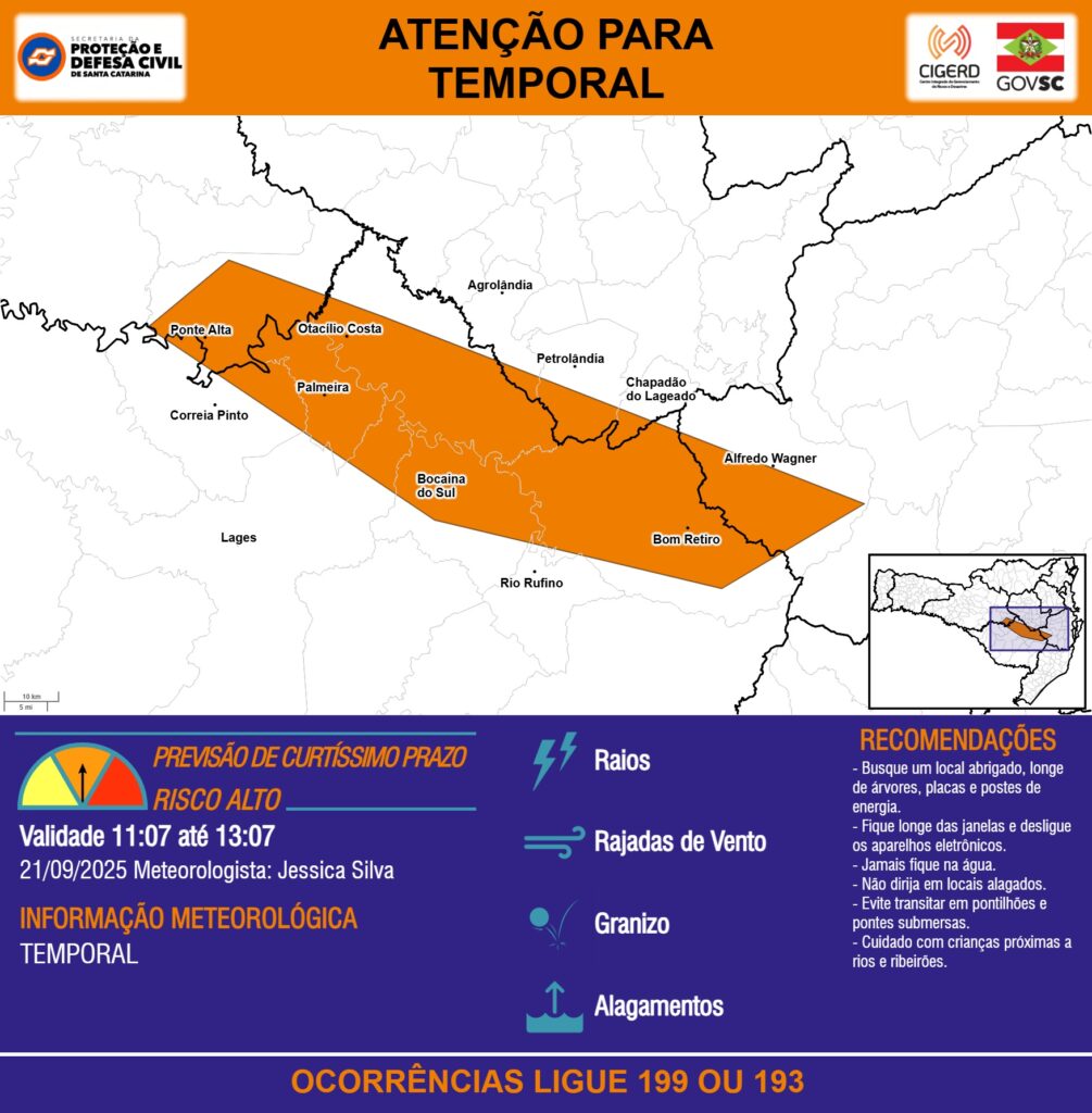ATENÇÃO – 21/09 11:07 – TEMPORAL com RAIOS, RAJADAS DE VENTO, GRANIZO e ALAGAMENTOS para os municípios de Agrolândia, Alfredo Wagner, Bocaina do Sul, Bom Retiro, Chapadão do Lageado, Correia Pinto, Lages, Otacílio Costa, Palmeira, Petrolândia, Ponte Alta e Rio Rufino nas próximas 2 horas. Ocorrências ligue 199 ou 193.