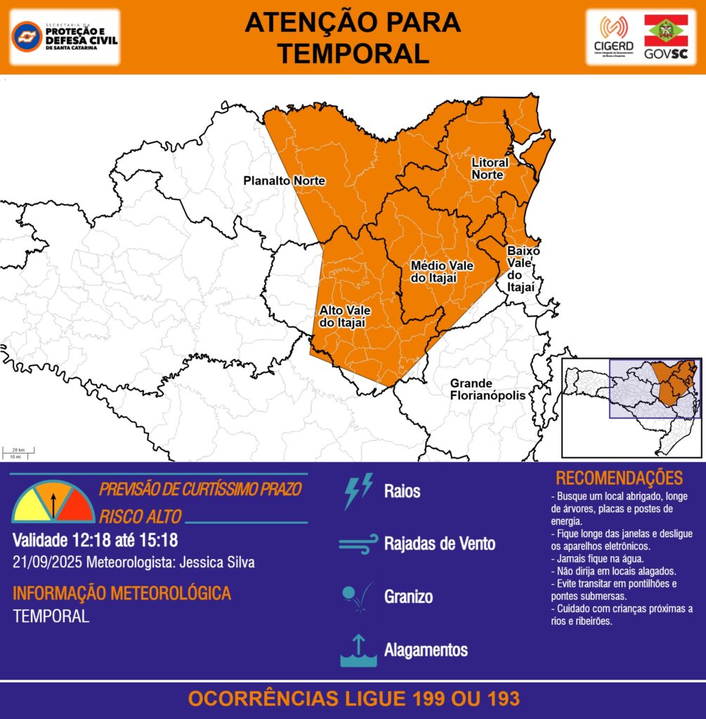 ATENÇÃO – 21/09 12:18 – TEMPORAL com RAIOS, RAJADAS DE VENTO, GRANIZO e ALAGAMENTOS para as regiões do Planalto Norte, Litoral Norte, Grande Florianópolis, Baixo, Médio e Alto Vale do Itajaí nas próximas 3 horas. Ocorrências ligue 199 ou 193.