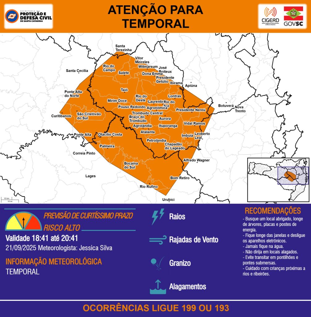 ATENÇÃO – 21/09 18:41 – TEMPORAL com RAIOS, RAJADAS DE VENTO, GRANIZO e ALAGAMENTOS para as regiões do Meio-Oeste, Planalto Norte, Planalto Sul, Grande Florianópolis, Médio e Alto Vale do Itajaí nas próximas 2 horas. Ocorrências ligue 199 ou 193.