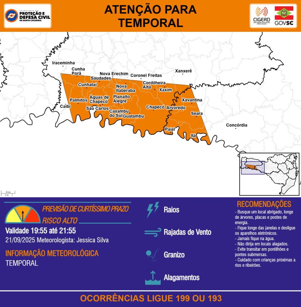 ATENÇÃO – 21/09 19:55 – TEMPORAL com RAIOS, RAJADAS DE VENTO, GRANIZO e ALAGAMENTOS para os municípios de Arvoredo, Caibi, Caxambu do Sul, Chapecó, Concórdia, Cordilheira Alta, Coronel Freitas, Cunha Porã, Cunhataí, Guatambu, Iraceminha, Itá, Nova Erechim, Nova Itaberaba, Paial, Palmitos, Planalto Alegre, Saudades, Seara, São Carlos, Xanxerê, Xavantina, Xaxim e Águas de Chapecó nas próximas 2 horas. Ocorrências ligue 199 ou 193.