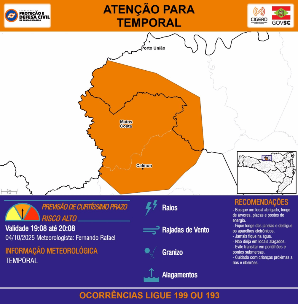 ATENÇÃO – 04/10 19:08 – TEMPORAL com RAIOS, RAJADAS DE VENTO, GRANIZO e ALAGAMENTOS para os municípios de Calmon, Matos Costa e Porto União na próxima hora. Ocorrências ligue 199 ou 193.