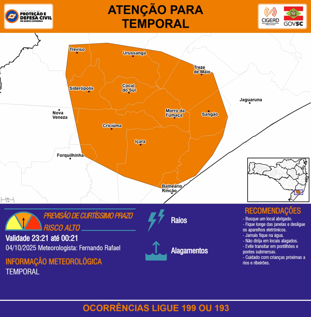 ATENÇÃO – 04/10 23:21 – TEMPORAL com RAIOS e ALAGAMENTOS para os municípios de Balneário Rincão, Cocal do Sul, Criciúma, Forquilhinha, Içara, Jaguaruna, Morro da Fumaça, Nova Veneza, Pedras Grandes, Sangão, Siderópolis, Treviso, Treze de Maio e Urussanga na próxima hora. Ocorrências ligue 199 ou 193. para os municípios de Balneário Rincão, Cocal do Sul, Criciúma, Forquilhinha, Içara, Jaguaruna, Morro da Fumaça, Nova Veneza, Pedras Grandes, Sangão, Siderópolis, Treviso, Treze de Maio e Urussanga na próxima hora. Ocorrências ligue 199 ou 193.
