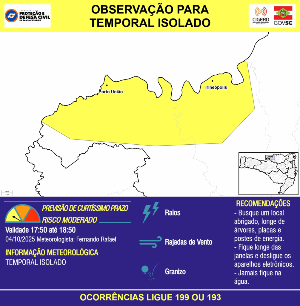 OBSERVAÇÃO – 04/10 17:50 – TEMPORAL ISOLADO com RAIOS, RAJADAS DE VENTO e GRANIZO para os municípios de Irineópolis e Porto União na próxima hora. Ocorrências ligue 199 ou 193.