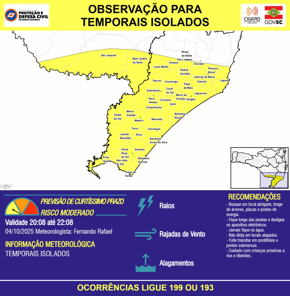 OBSERVAÇÃO – 04/10 20:08 – TEMPORAIS ISOLADOS com RAIOS, RAJADAS DE VENTO e ALAGAMENTOS pontuais para os municípios de Araranguá, Balneário Arroio do Silva, Balneário Gaivota, Balneário Rincão, Bom Jardim da Serra, Braço do Norte, Capivari de Baixo, Cocal do Sul, Criciúma, Ermo, Forquilhinha, Gravatal, Içara, Jacinto Machado, Jaguaruna, Laguna, Lauro Müller, Maracajá, Meleiro, Morro Grande, Morro da Fumaça, Nova Veneza, Orleans, Passo de Torres, Pedras Grandes, Pescaria Brava, Praia Grande, Sangão, Santa Rosa do Sul, Siderópolis, Sombrio, São Joaquim, São João do Sul, São Ludgero, Timbé do Sul, Treviso, Treze de Maio, Tubarão, Turvo e Urussanga nas próximas 2 horas. Ocorrências ligue 199 ou 193.