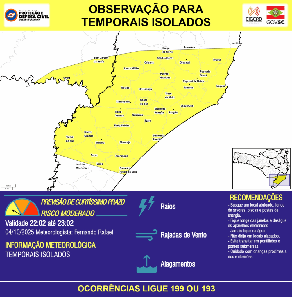 OBSERVAÇÃO – 04/10 22:02 – TEMPORAIS ISOLADOS com RAIOS, RAJADAS DE VENTO e ALAGAMENTOS pontuais para os municípios de Araranguá, Armazém, Balneário Arroio do Silva, Balneário Rincão, Bom Jardim da Serra, Braço do Norte, Capivari de Baixo, Cocal do Sul, Criciúma, Ermo, Forquilhinha, Gravatal, Imaruí, Imbituba, Içara, Jacinto Machado, Jaguaruna, Laguna, Lauro Müller, Maracajá, Meleiro, Morro Grande, Morro da Fumaça, Nova Veneza, Orleans, Pedras Grandes, Pescaria Brava, Sangão, Siderópolis, São Ludgero, Timbé do Sul, Treviso, Treze de Maio, Tubarão, Turvo e Urussanga na próxima hora. Ocorrências ligue 199 ou 193.