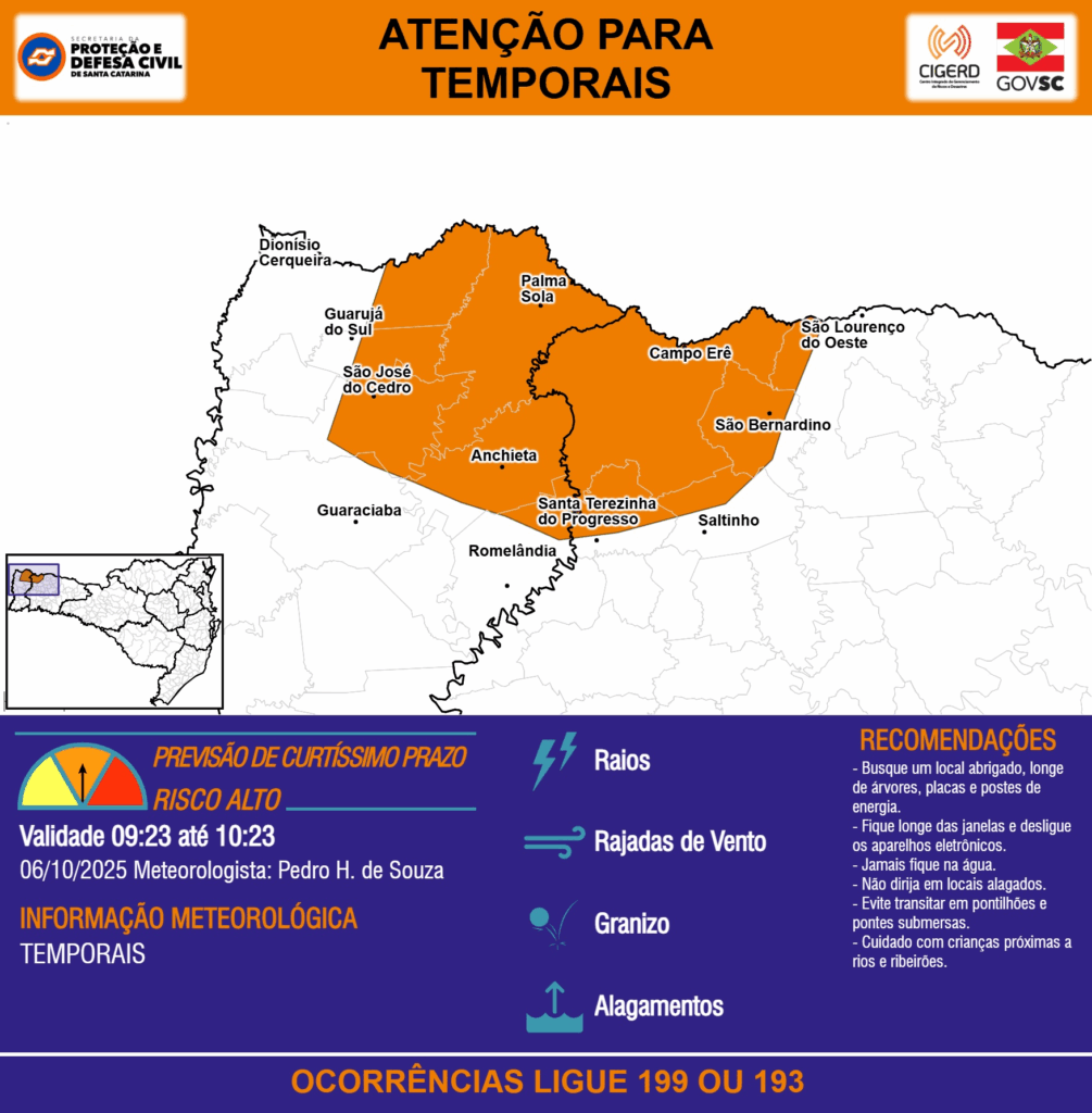 ATENÇÃO – 06/10 09:23 – TEMPORAIS com RAIOS, RAJADAS DE VENTO, GRANIZO e ALAGAMENTOS para os municípios de Anchieta, Campo Erê, Dionísio Cerqueira, Guaraciaba, Guarujá do Sul, Palma Sola, Romelândia, Saltinho, Santa Terezinha do Progresso, São Bernardino, São José do Cedro e São Lourenço do Oeste na próxima hora. Ocorrências ligue 199 ou 193.