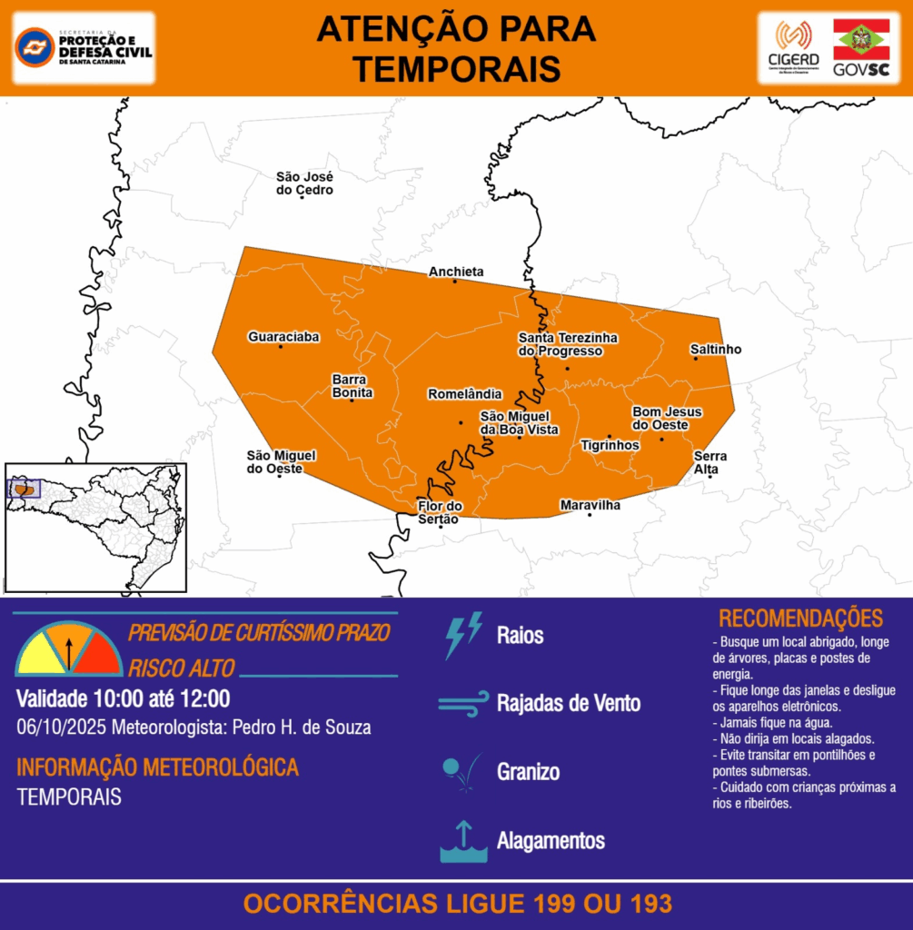 ATENÇÃO – 06/10 10:00 – TEMPORAIS com RAIOS, RAJADAS DE VENTO, GRANIZO e ALAGAMENTOS para os municípios de Anchieta, Barra Bonita, Bom Jesus do Oeste, Flor do Sertão, Guaraciaba, Maravilha, Romelândia, Saltinho, Santa Terezinha do Progresso, Serra Alta, São José do Cedro, São Miguel da Boa Vista, São Miguel do Oeste e Tigrinhos nas próximas 2 horas. Ocorrências ligue 199 ou 193.