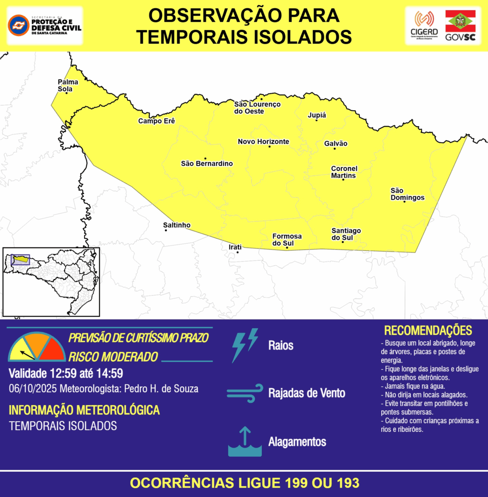 OBSERVAÇÃO – 06/10 12:59 – TEMPORAIS ISOLADOS com RAIOS, RAJADAS DE VENTO e ALAGAMENTOS pontuais para os municípios de Campo Erê, Coronel Martins, Formosa do Sul, Galvão, Irati, Jupiá, Novo Horizonte, Palma Sola, Saltinho, Santiago do Sul, São Bernardino, São Domingos e São Lourenço do Oeste nas próximas 2 horas. Ocorrências ligue 199 ou 193.