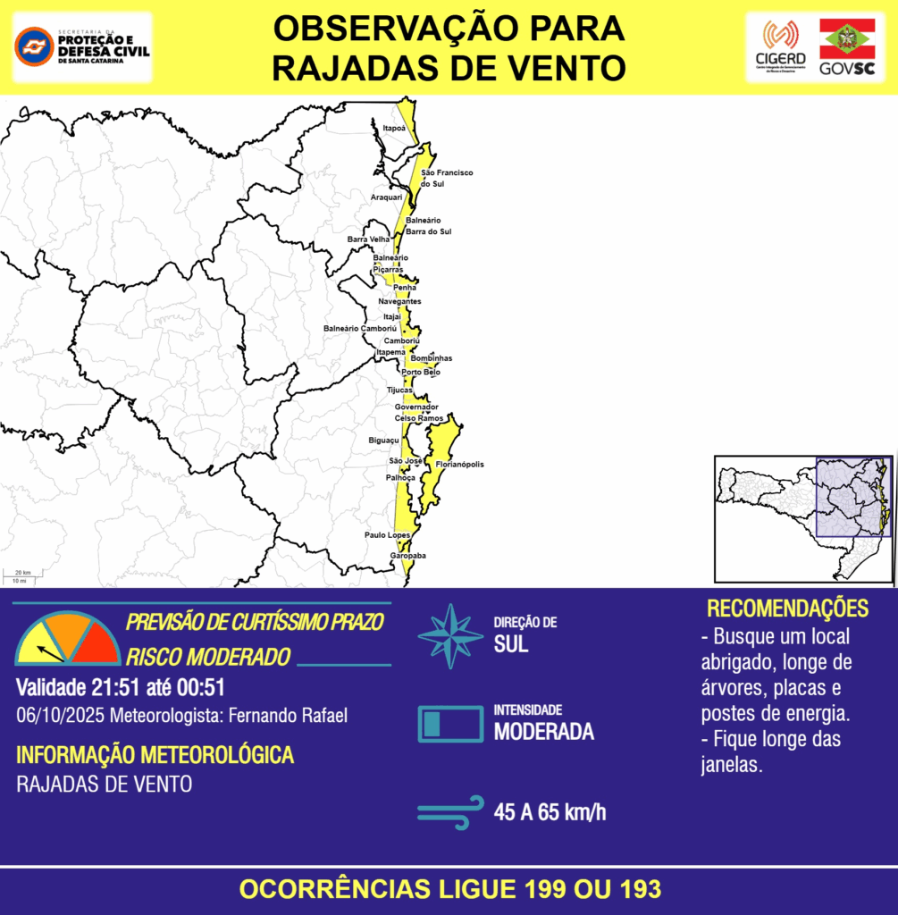 OBSERVAÇÃO – 06/10 21:51 – RAJADAS DE VENTO de quadrante sul, com intensidade MODERADA (45 a 65 km/h), para os municípios de Araquari, Balneário Barra do Sul, Balneário Camboriú, Balneário Piçarras, Barra Velha, Biguaçu, Bombinhas, Camboriú, Florianópolis, Garopaba, Governador Celso Ramos, Itajaí, Itapema, Itapoá, Navegantes, Palhoça, Paulo Lopes, Penha, Porto Belo, São Francisco do Sul, São José e Tijucas nas próximas 3 horas. Ocorrências ligue 199 ou 193.