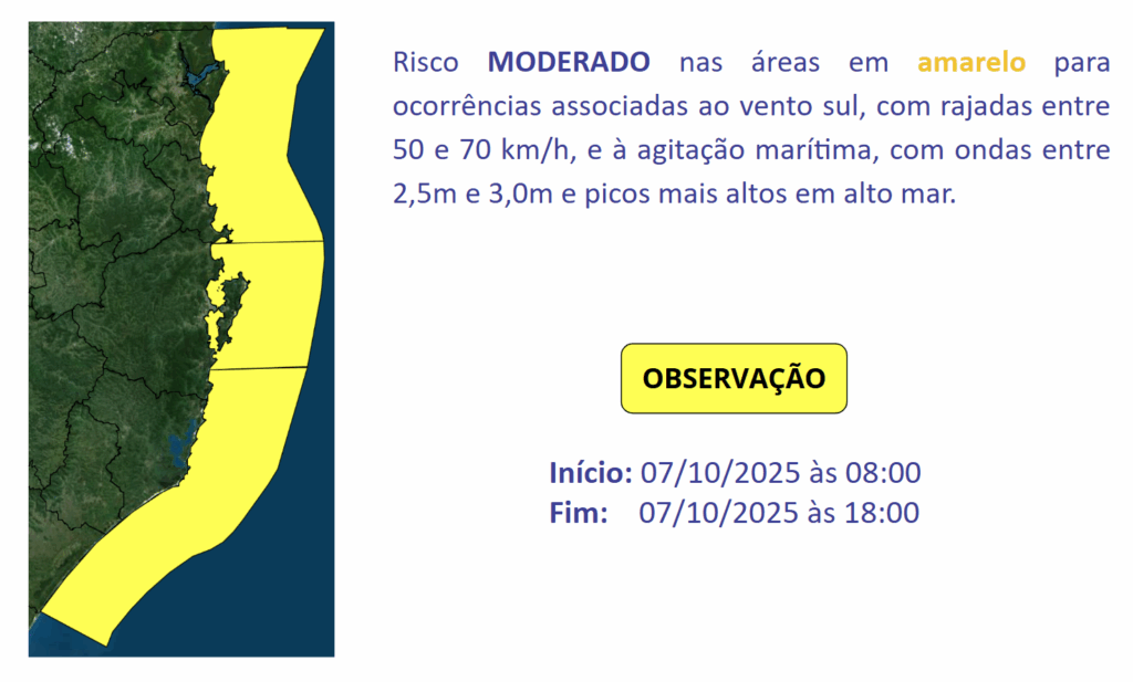 Nesta terça-feira (07), o vento sul se mantém persistente no litoral catarinense, deixando o mar agitado. O risco é moderado para ocorrências associadas às rajadas de vento e à agitação marítima em toda a faixa litorânea.