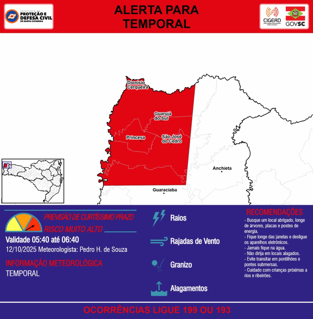 ALERTA – 12/10 05:40 – TEMPORAL com RAIOS, RAJADAS DE VENTO, GRANIZO e ALAGAMENTOS para os municípios de Anchieta, Dionísio Cerqueira, Guaraciaba, Guarujá do Sul, Princesa e São José do Cedro na próxima hora. Ocorrências ligue 199 ou 193.