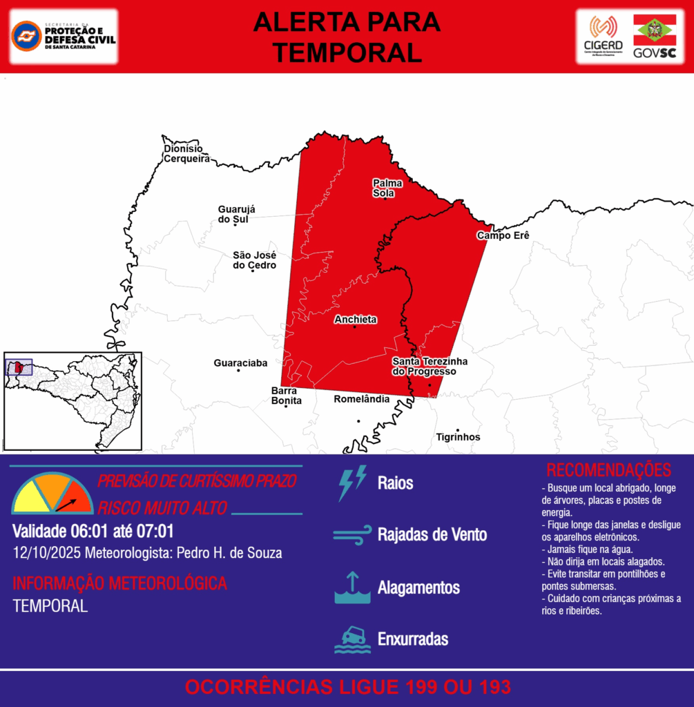 ALERTA – 12/10 06:01 – TEMPORAL com RAIOS, RAJADAS DE VENTO, ALAGAMENTOS e risco de ENXURRADAS para os municípios de Anchieta, Barra Bonita, Campo Erê, Dionísio Cerqueira, Guaraciaba, Guarujá do Sul, Palma Sola, Romelândia, Santa Terezinha do Progresso, São José do Cedro e Tigrinhos na próxima hora. Ocorrências ligue 199 ou 193.