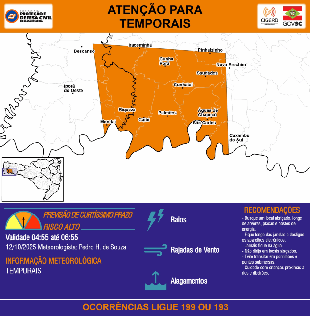 ATENÇÃO – 12/10 04:55 – TEMPORAIS com RAIOS, RAJADAS DE VENTO e ALAGAMENTOS para os municípios de Caibi, Caxambu do Sul, Cunha Porã, Cunhataí, Descanso, Iporã do Oeste, Iraceminha, Mondaí, Nova Erechim, Palmitos, Pinhalzinho, Riqueza, Saudades, São Carlos e Águas de Chapecó nas próximas 2 horas. Ocorrências ligue 199 ou 193.