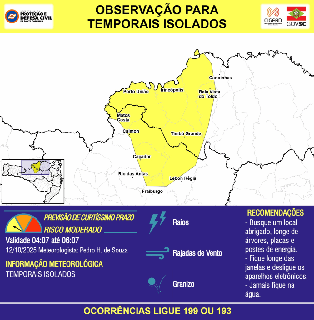 OBSERVAÇÃO – 12/10 04:07 – TEMPORAIS ISOLADOS com RAIOS, RAJADAS DE VENTO e GRANIZO para os municípios de Bela Vista do Toldo, Calmon, Canoinhas, Caçador, Fraiburgo, Irineópolis, Lebon Régis, Matos Costa, Porto União, Rio das Antas e Timbó Grande nas próximas 2 horas. Ocorrências ligue 199 ou 193.