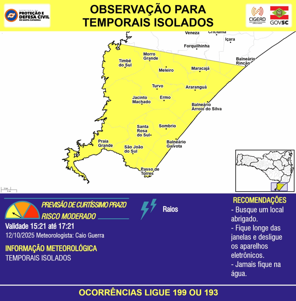 OBSERVAÇÃO – 12/10 15:21 – TEMPORAIS ISOLADOS com RAIOS para a região do Litoral Sul nas próximas 2 horas. Ocorrências ligue 199 ou 193.