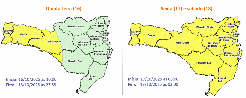 Entre a quinta-feira (16) e a madrugada do sábado (18) a formação e o avanço de uma frente fria voltam a favorecer condições para temporais isolados e chuva pontualmente intensa em Santa Catarina. O risco é baixo a moderado para ocorrências relacionadas a alagamentos, danos na rede elétrica, destelhamentos e queda de galhos de árvores.