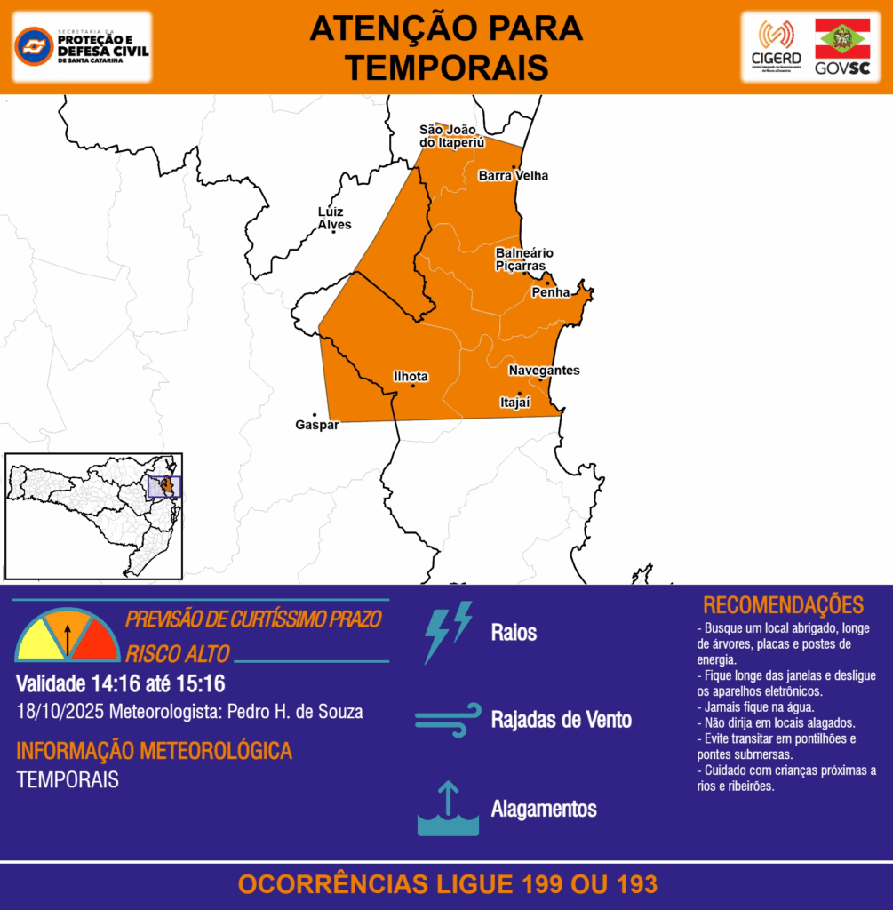 ATENÇÃO – 18/10 14:16 – TEMPORAIS com RAIOS, RAJADAS DE VENTO e ALAGAMENTOS para os municípios de Balneário Piçarras, Barra Velha, Gaspar, Ilhota, Itajaí, Luiz Alves, Navegantes, Penha e São João do Itaperiú na próxima hora. Ocorrências ligue 199 ou 193.