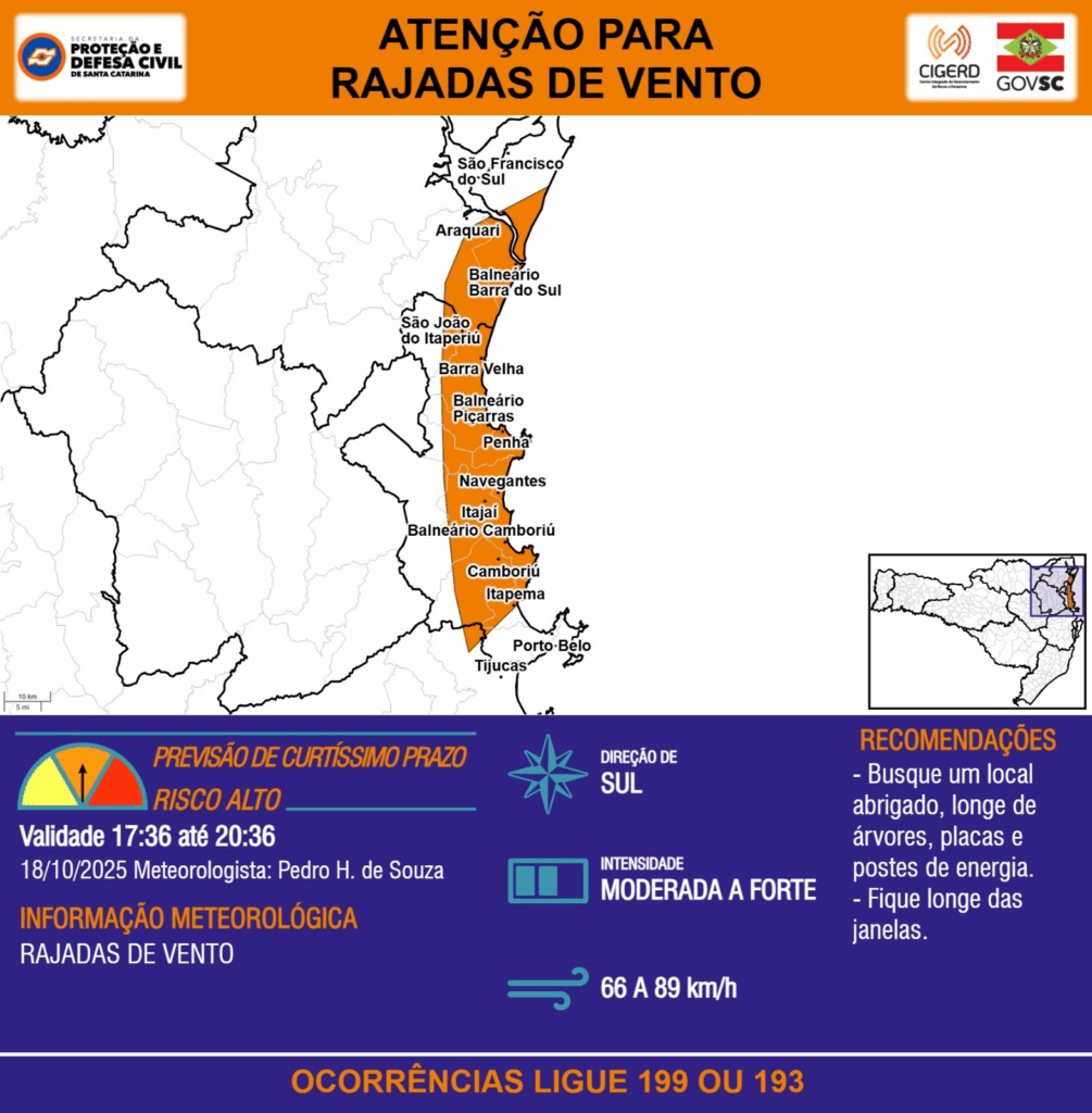 ATENÇÃO – 18/10 17:36 – RAJADAS DE VENTO de quadrante sul, com intensidade MODERADA A FORTE (66 a 89 km/h), para os municípios de Araquari, Balneário Barra do Sul, Balneário Camboriú, Balneário Piçarras, Barra Velha, Camboriú, Itajaí, Itapema, Navegantes, Penha, Porto Belo, São Francisco do Sul, São João do Itaperiú e Tijucas nas próximas 3 horas. Ocorrências ligue 199 ou 193.