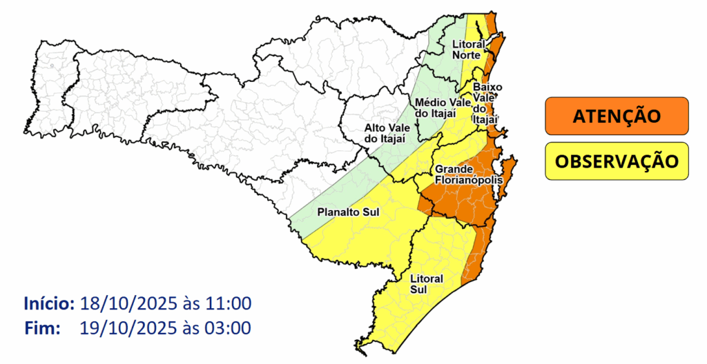 Atualização: Atenção Meteorológica SDC/SC 18/10 07:40 – Rajadas de vento do quadrante sul entre a tarde de sábado (18) e a madrugada do domingo (19)