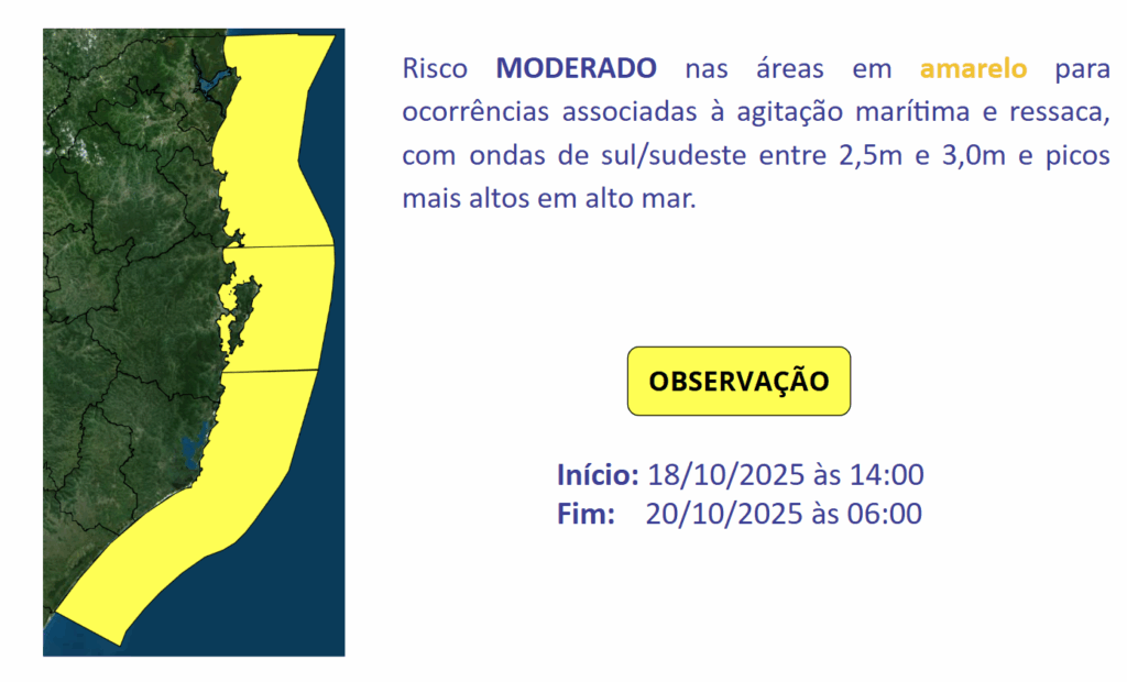 Atualização: Observação Marítima SDC/SC 18/10 08:10 – Mar agitado e risco de ressaca entre esse sábado (18) e a madrugada de segunda (20)