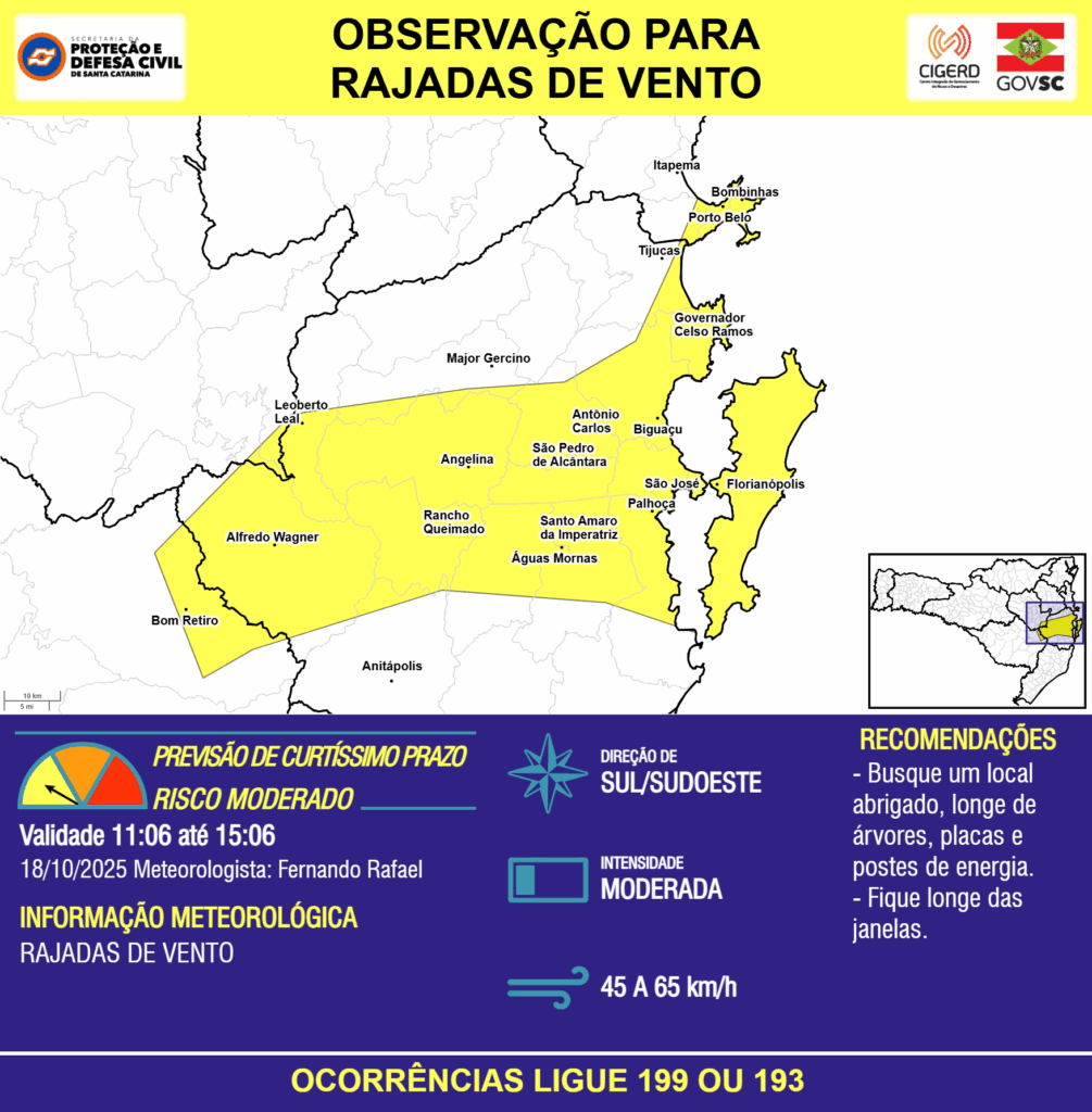 OBSERVAÇÃO – 18/10 11:06 – RAJADAS DE VENTO de quadrante sul/sudoeste, com intensidade MODERADA (45 a 65 km/h), para os municípios de Alfredo Wagner, Angelina, Anitápolis, Antônio Carlos, Biguaçu, Bom Retiro, Bombinhas, Florianópolis, Governador Celso Ramos, Itapema, Leoberto Leal, Major Gercino, Palhoça, Porto Belo, Rancho Queimado, Santo Amaro da Imperatriz, São José, São Pedro de Alcântara, Tijucas e Águas Mornas nas próximas 4 horas. Ocorrências ligue 199 ou 193.
