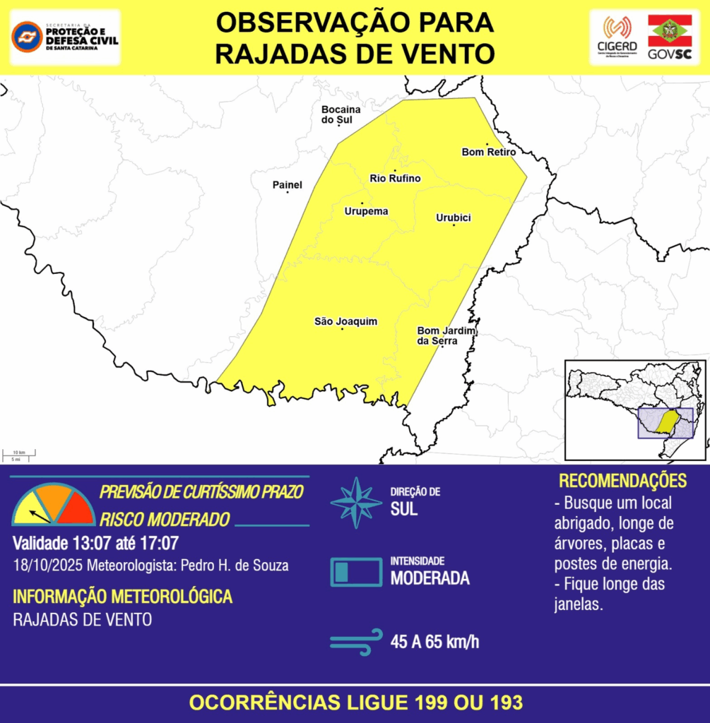 OBSERVAÇÃO – 18/10 13:07 – RAJADAS DE VENTO de quadrante sul, com intensidade MODERADA (45 a 65 km/h), para os municípios de Bocaina do Sul, Bom Jardim da Serra, Bom Retiro, Painel, Rio Rufino, São Joaquim, Urubici e Urupema nas próximas 4 horas. Ocorrências ligue 199 ou 193.
