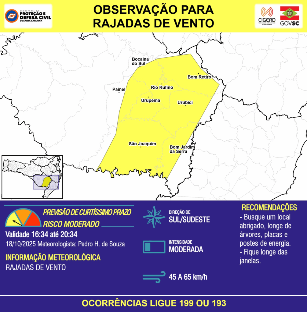 OBSERVAÇÃO – 18/10 16:34 – RAJADAS DE VENTO de quadrante sul/sudeste, com intensidade MODERADA (45 a 65 km/h), para os municípios de Bocaina do Sul, Bom Jardim da Serra, Bom Retiro, Painel, Rio Rufino, São Joaquim, Urubici e Urupema nas próximas 4 horas. Ocorrências ligue 199 ou 193.
