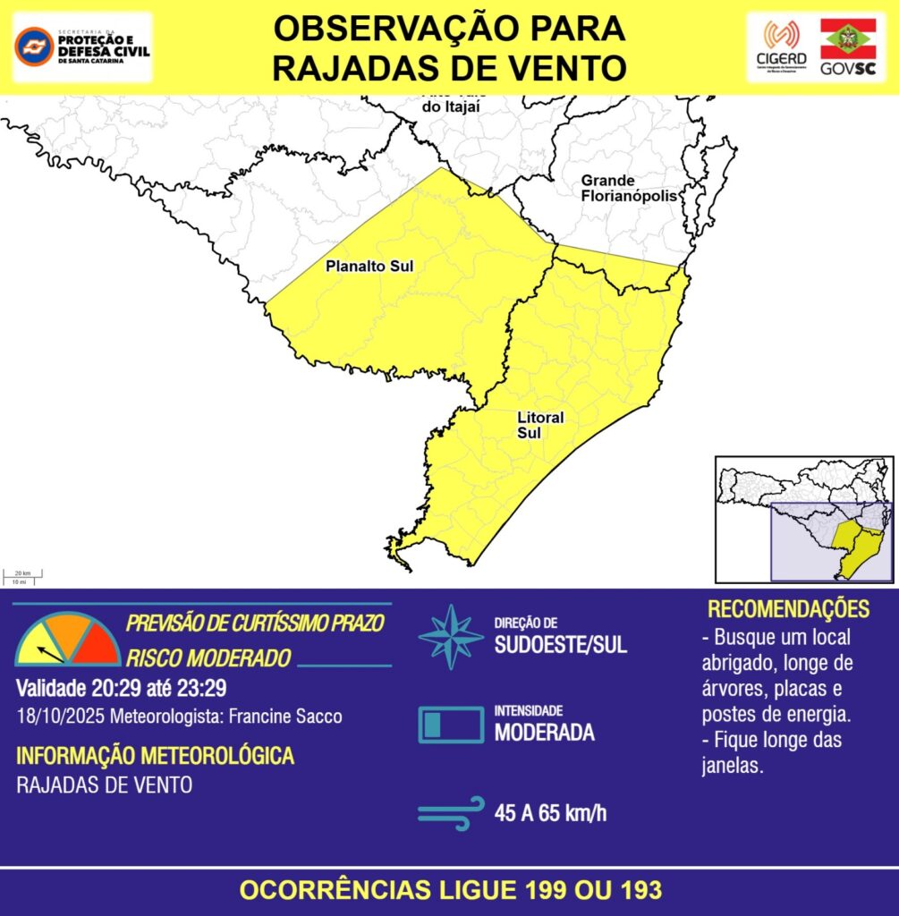 OBSERVAÇÃO – 18/10 20:29 – RAJADAS DE VENTO de quadrante sudoeste/sul, com intensidade MODERADA (45 a 65 km/h), para as regiões do Planalto Sul, Litoral Sul, Grande Florianópolis e Alto Vale do Itajaí nas próximas 3 horas. Ocorrências ligue 199 ou 193.