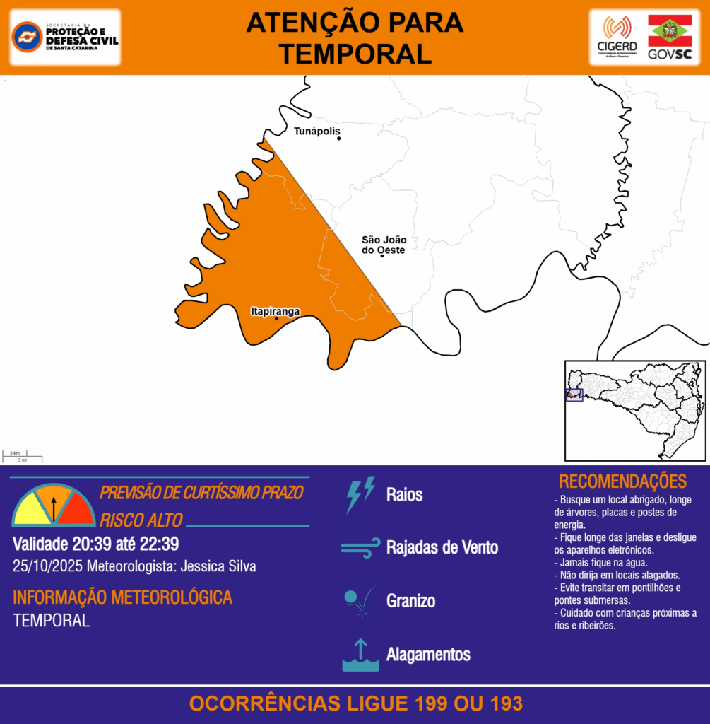 ATENÇÃO – 25/10 20:39 – TEMPORAL com RAIOS, RAJADAS DE VENTO, GRANIZO e ALAGAMENTOS para os municípios de Itapiranga, São João do Oeste e Tunápolis nas próximas 2 horas. Ocorrências ligue 199 ou 193.