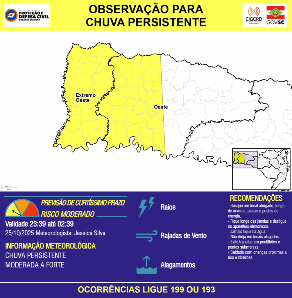 OBSERVAÇÃO – 25/10 23:39 – CHUVA PERSISTENTE de intensidade moderada a forte com RAIOS, RAJADAS DE VENTO e ALAGAMENTOS pontuais para as regiões do Extremo Oeste e Oeste nas próximas 3 horas. Ocorrências ligue 199 ou 193.
