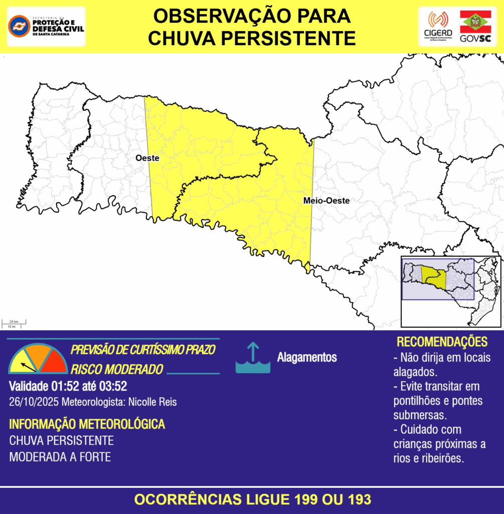 OBSERVAÇÃO – 26/10 01:52 – CHUVA PERSISTENTE de intensidade moderada a forte com ALAGAMENTOS pontuais para as regiões do Oeste, Meio-Oeste e Planalto Sul nas próximas 2 horas. Ocorrências ligue 199 ou 193.