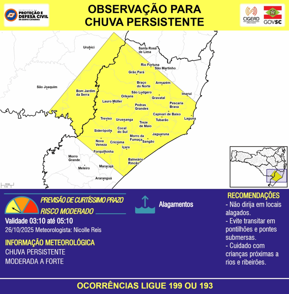 OBSERVAÇÃO – 26/10 03:10 – CHUVA PERSISTENTE de intensidade moderada a forte com ALAGAMENTOS pontuais para as regiões do Planalto Sul e Litoral Sul nas próximas 2 horas. Ocorrências ligue 199 ou 193.