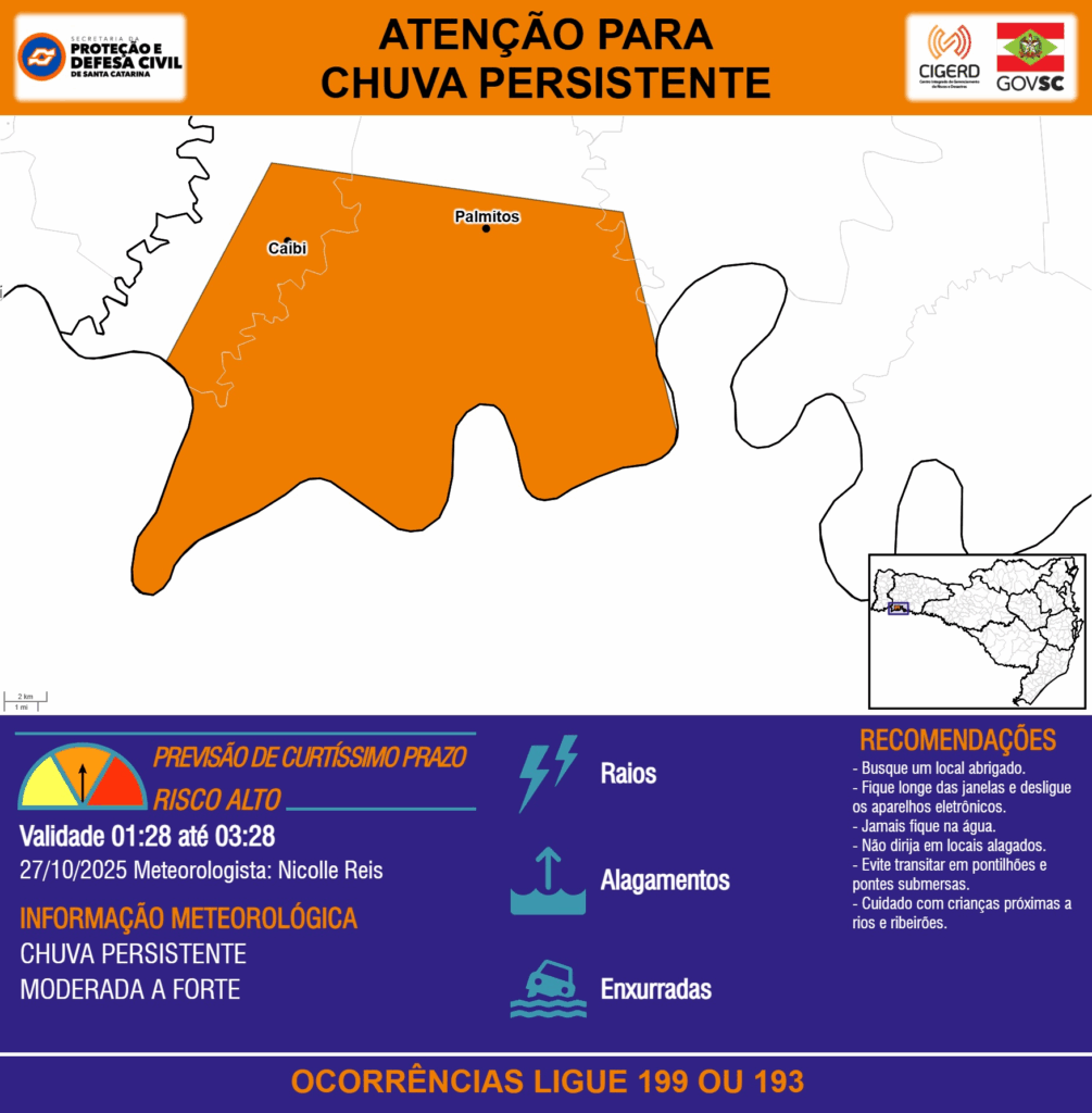 ATENÇÃO – 27/10 01:28 – CHUVA PERSISTENTE de intensidade moderada a forte com RAIOS, ALAGAMENTOS e risco de ENXURRADAS para os municípios de Caibi, Mondaí, Palmitos nas próximas 2 horas. Ocorrências ligue 199 ou 193.
