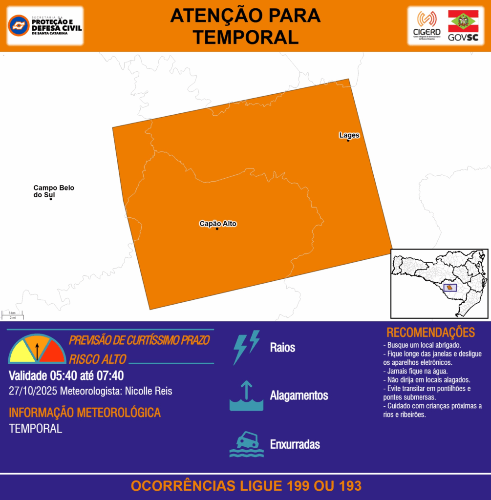 ATENÇÃO – 27/10 05:40 – TEMPORAL com RAIOS, ALAGAMENTOS e risco de ENXURRADAS para os municípios de Campo Belo do Sul, Capão Alto, Lages e São José do Cerrito nas próximas 2 horas. Ocorrências ligue 199 ou 193.