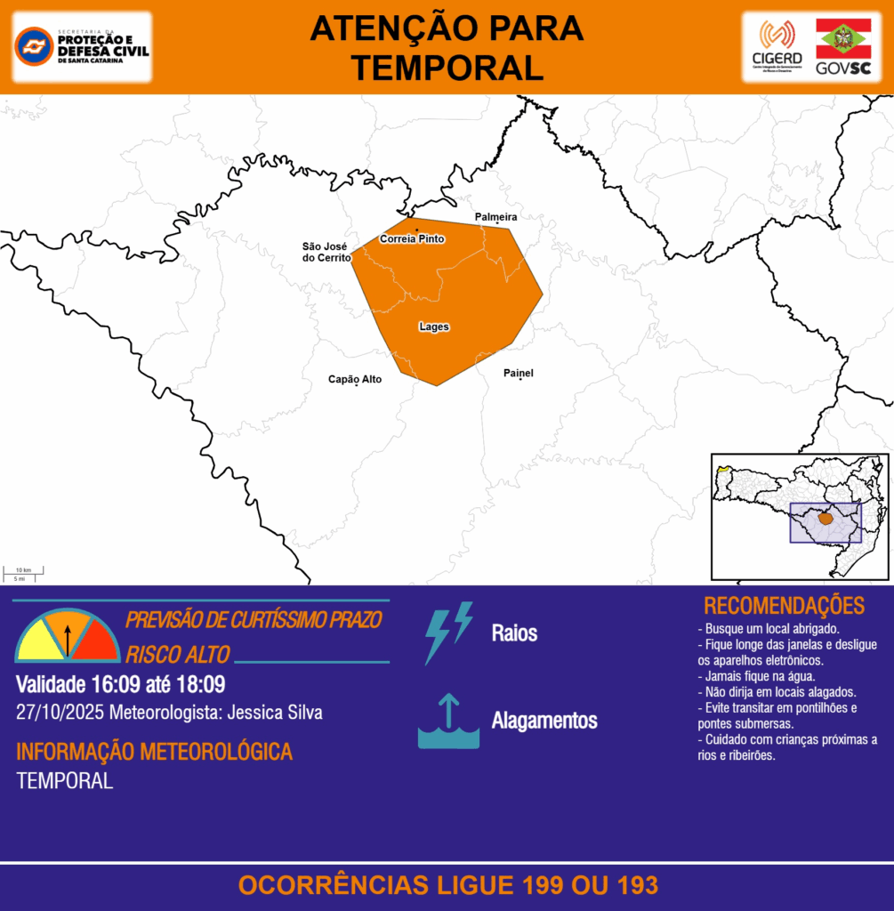 ATENÇÃO – 27/10 16:09 – TEMPORAL com RAIOS e ALAGAMENTOS para os municípios de Capão Alto, Correia Pinto, Lages, Painel, Palmeira e São José do Cerrito nas próximas 2 horas. Ocorrências ligue 199 ou 193.