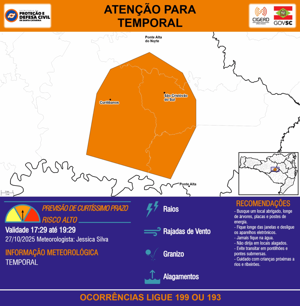 ATENÇÃO – 27/10 17:29 – TEMPORAL com RAIOS, RAJADAS DE VENTO, GRANIZO e ALAGAMENTOS para os municípios de Curitibanos, Ponte Alta, Ponte Alta do Norte e São Cristóvão do Sul nas próximas 2 horas. Ocorrências ligue 199 ou 193.