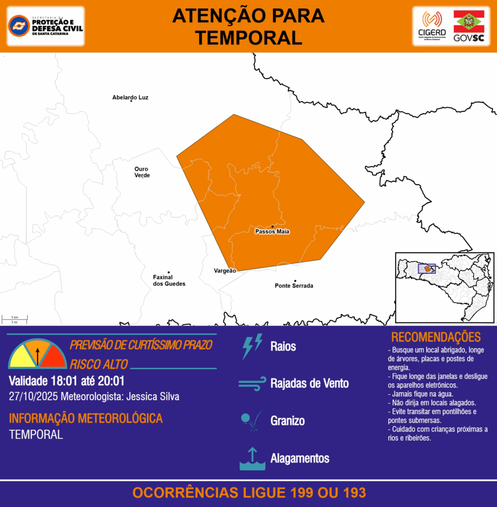 ATENÇÃO – 27/10 18:01 – TEMPORAL com RAIOS, RAJADAS DE VENTO, GRANIZO e ALAGAMENTOS para os municípios de Abelardo Luz, Faxinal dos Guedes, Ouro Verde, Passos Maia, Ponte Serrada e Vargeão nas próximas 2 horas. Ocorrências ligue 199 ou 193.