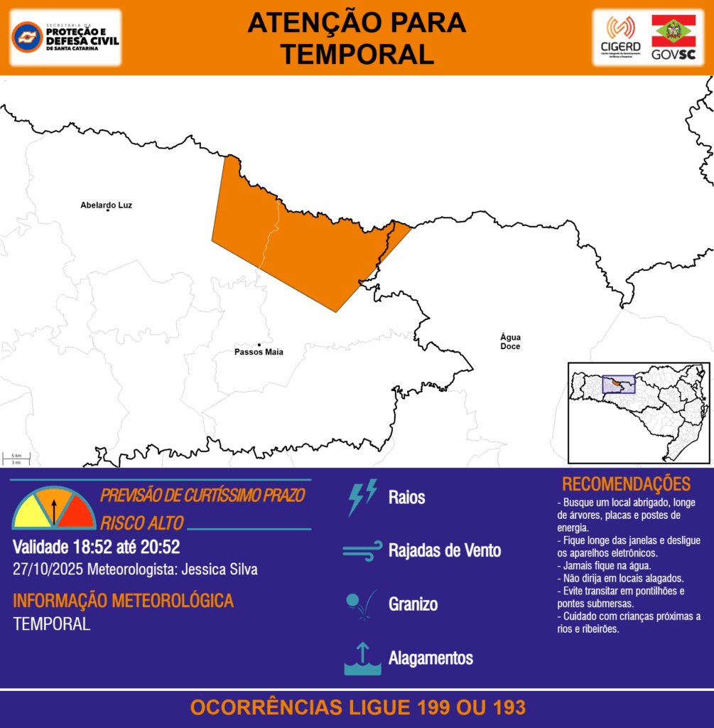 ATENÇÃO – 27/10 18:52 – TEMPORAL com RAIOS, RAJADAS DE VENTO, GRANIZO e ALAGAMENTOS para os municípios de Abelardo Luz, Passos Maia e Água Doce nas próximas 2 horas. Ocorrências ligue 199 ou 193.