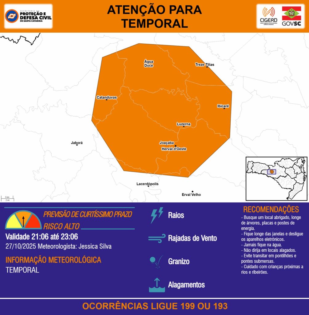 ATENÇÃO – 27/10 21:06 – TEMPORAL com RAIOS, RAJADAS DE VENTO, GRANIZO e ALAGAMENTOS para os municípios de Catanduvas, Erval Velho, Herval d’Oeste, Ibicaré, Jaborá, Joaçaba, Lacerdópolis, Luzerna, Treze Tílias e Água Doce nas próximas 2 horas. Ocorrências ligue 199 ou 193.