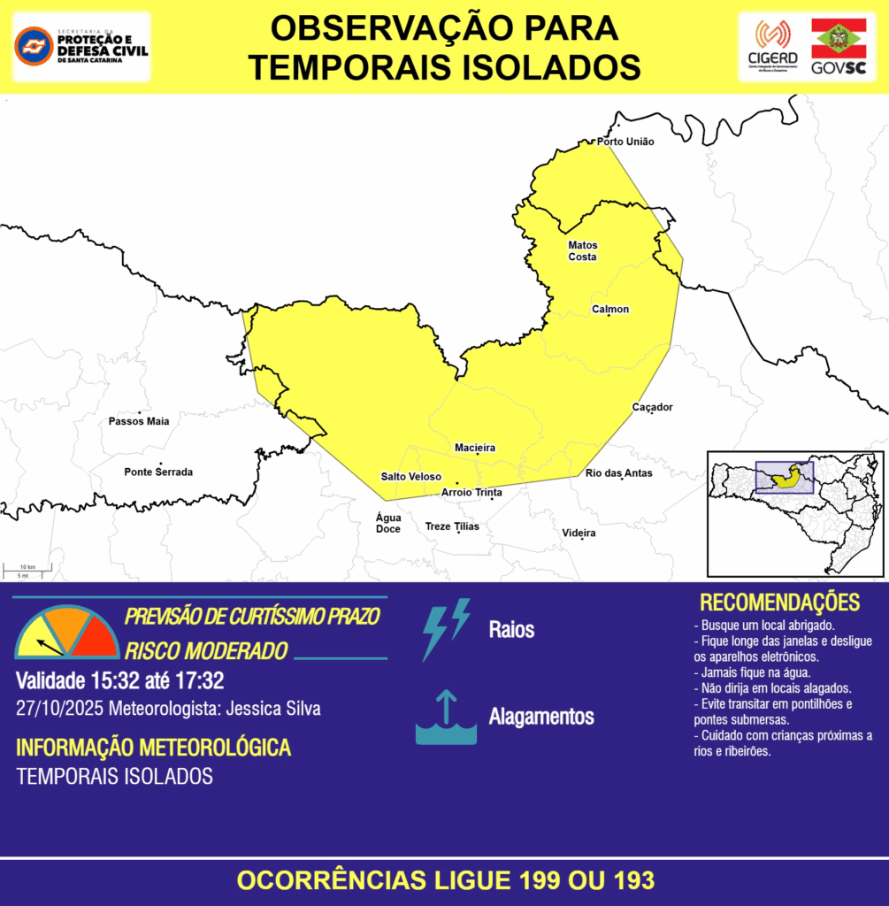 OBSERVAÇÃO – 27/10 15:32 – TEMPORAIS ISOLADOS com RAIOS e ALAGAMENTOS pontuais para os municípios de Arroio Trinta, Calmon, Caçador, Macieira, Matos Costa, Passos Maia, Ponte Serrada, Porto União, Rio das Antas, Salto Veloso, Treze Tílias, Videira e Água Doce nas próximas 2 horas. Ocorrências ligue 199 ou 193.