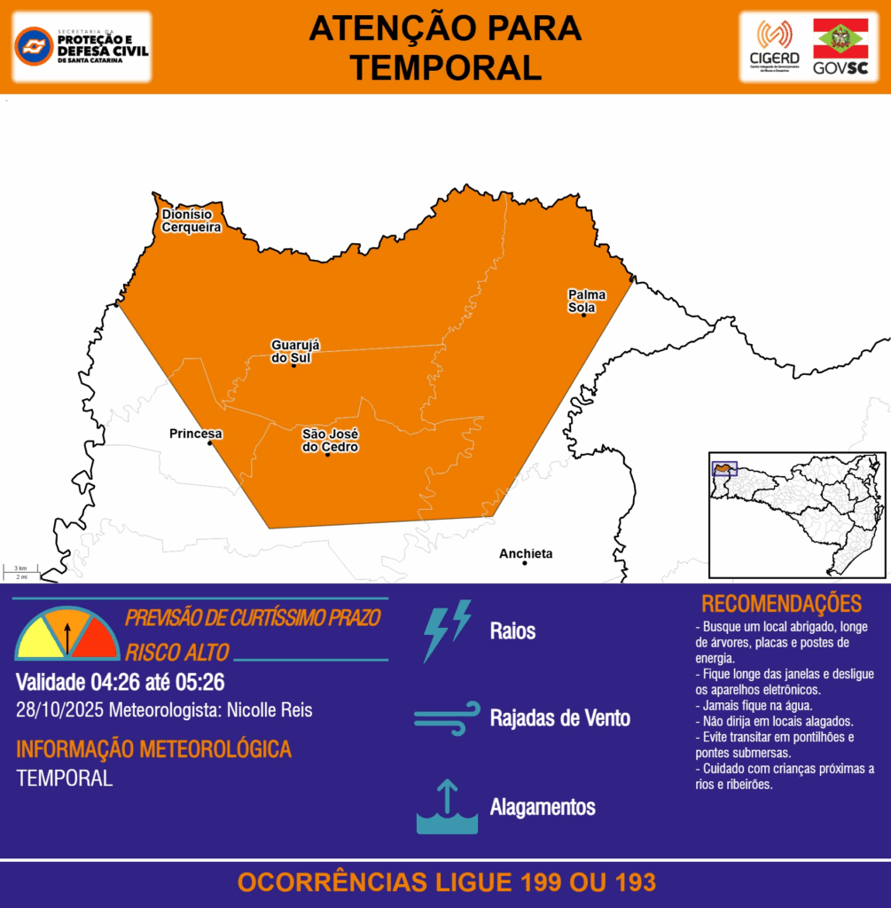 ATENÇÃO – 28/10 04:26 – TEMPORAL com RAIOS, RAJADAS DE VENTO e ALAGAMENTOS para os municípios de Anchieta, Dionísio Cerqueira, Guarujá do Sul, Palma Sola, Princesa e São José do Cedro na próxima hora. Ocorrências ligue 199 ou 193.