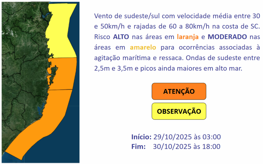 Entre esta quarta (29) e a quinta-feira (30), o mar fica agitado em todo o litoral catarinense, com ondas de direção sudeste, entre 2,5 e 3,5m e picos maiores em alto mar. As ondas começam a subir a partir da madrugada da quarta-feira, atingindo seu pico entre a noite da quarta e a madrugada da quinta-feira. O risco é moderado a alto para ocorrências associadas à agitação marítima e ressaca.