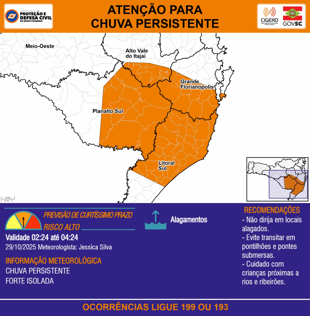 ATENÇÃO – 29/10 02:24 – CHUVA PERSISTENTE de intensidade forte isolada com ALAGAMENTOS para as regiões do Meio-Oeste, Planalto Sul, Litoral Sul, Grande Florianópolis e Alto Vale do Itajaí nas próximas 2 horas. Ocorrências ligue 199 ou 193.