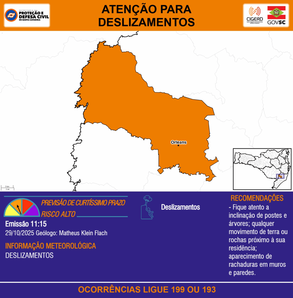 ATENÇÃO – 29/10 11:15 – DESLIZAMENTOS para o município de Orleans. Ocorrências ligue 199 ou 193.