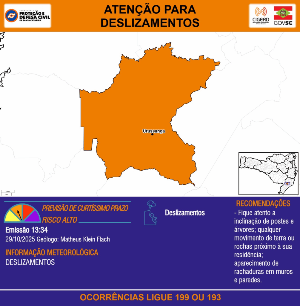 ATENÇÃO – 29/10 13:34 – DESLIZAMENTOS para o município de Urussanga. Ocorrências ligue 199 ou 193.